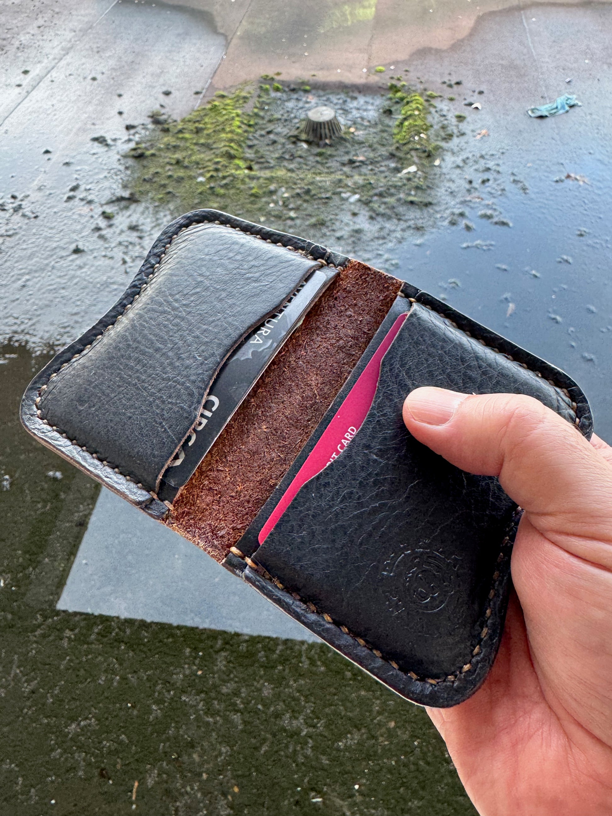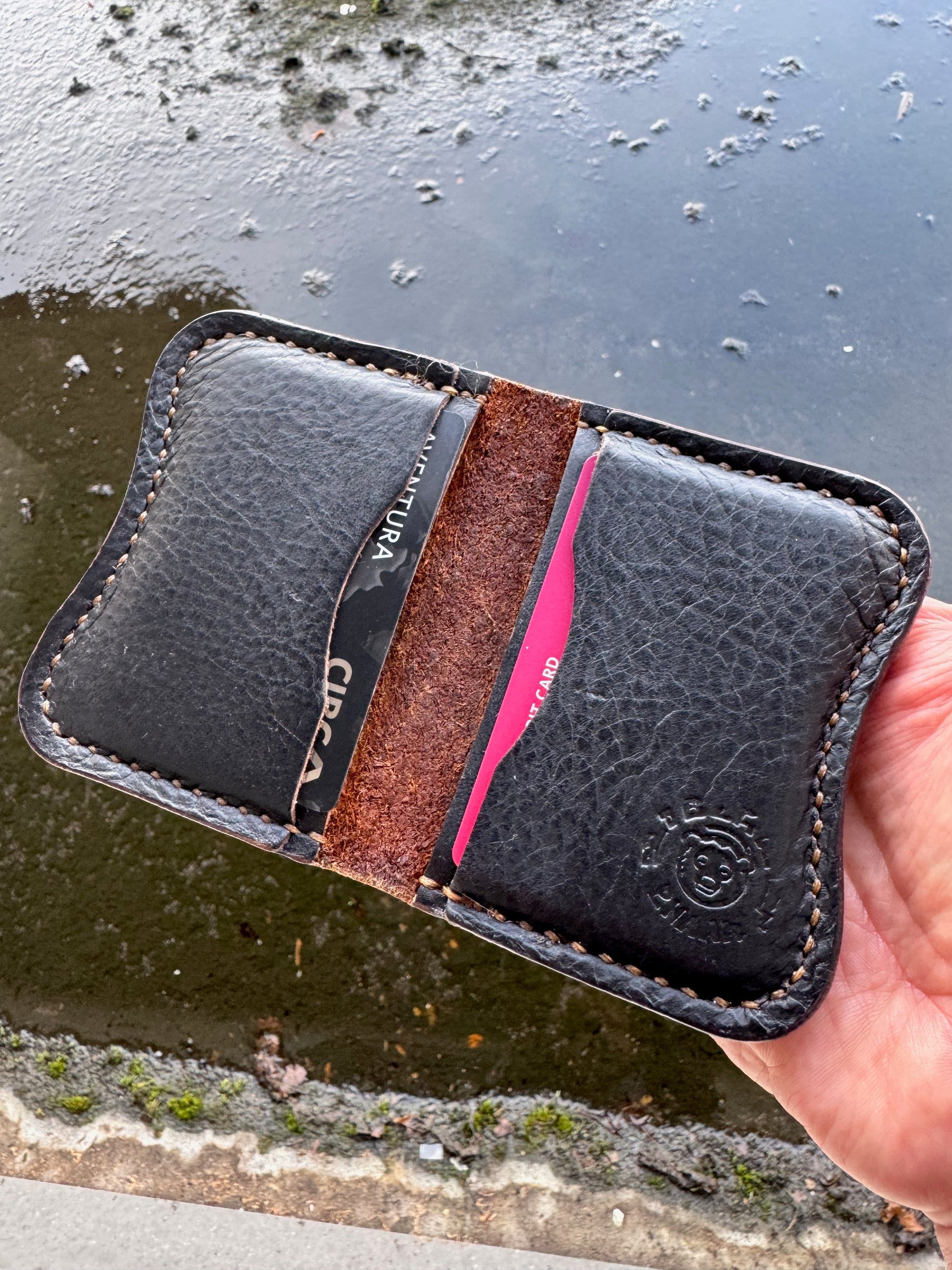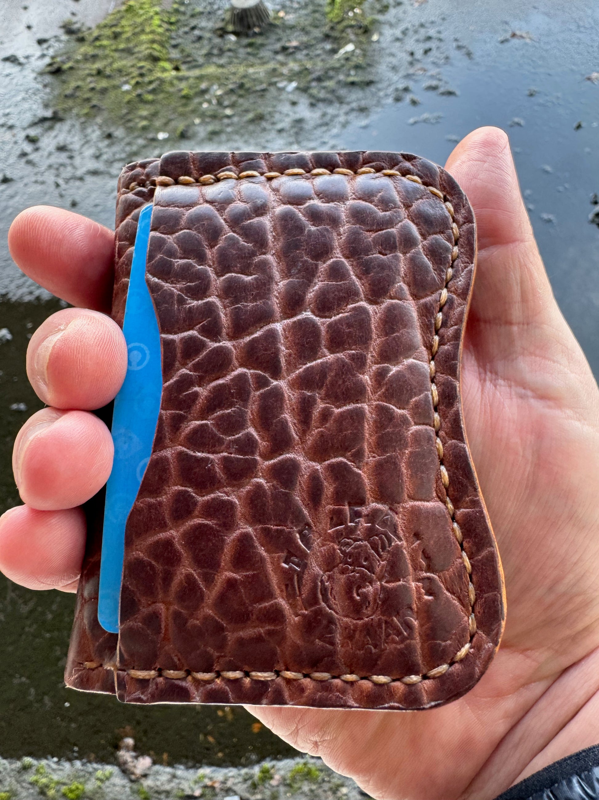 Bison and Horween Chromexcel Hip-Po. The tank of a wallet. The last one you will ever need. Fully hand cut and hand stitched. Iggy's original ergonomic design with the signature Hip-Po curve. Fits almost in any small pocket, compact. Fun.
